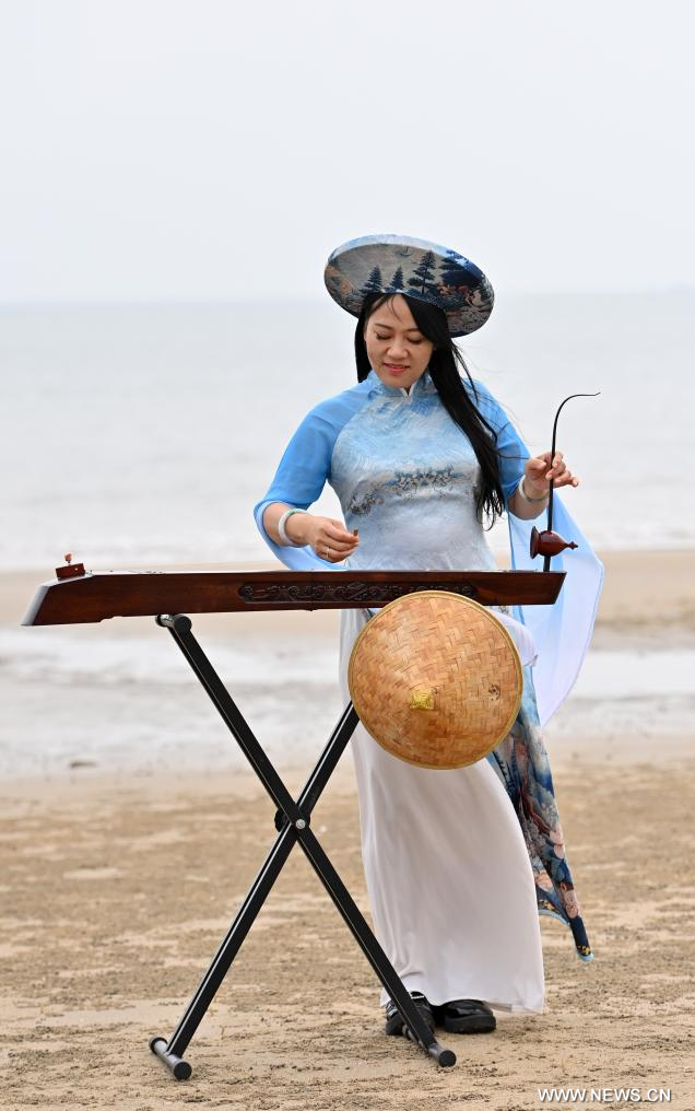 تظهر الصور سو هاي تشن تعزف على آلة “دوشيانتشين”، أو آلة موسيقية ذات وتر واحد، على شاطئ جينتان في مدينة دونغشينغ بمنطقة قوانغشي ذاتية الحكم لقومية تشوانغ في جنوبي الصين، ما يعرض السحر الفريد للآلة الموسيقية الخاصة لمجموعة جينغ الإثنية.