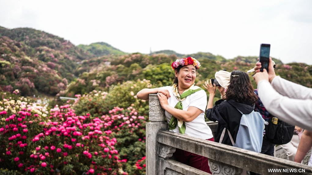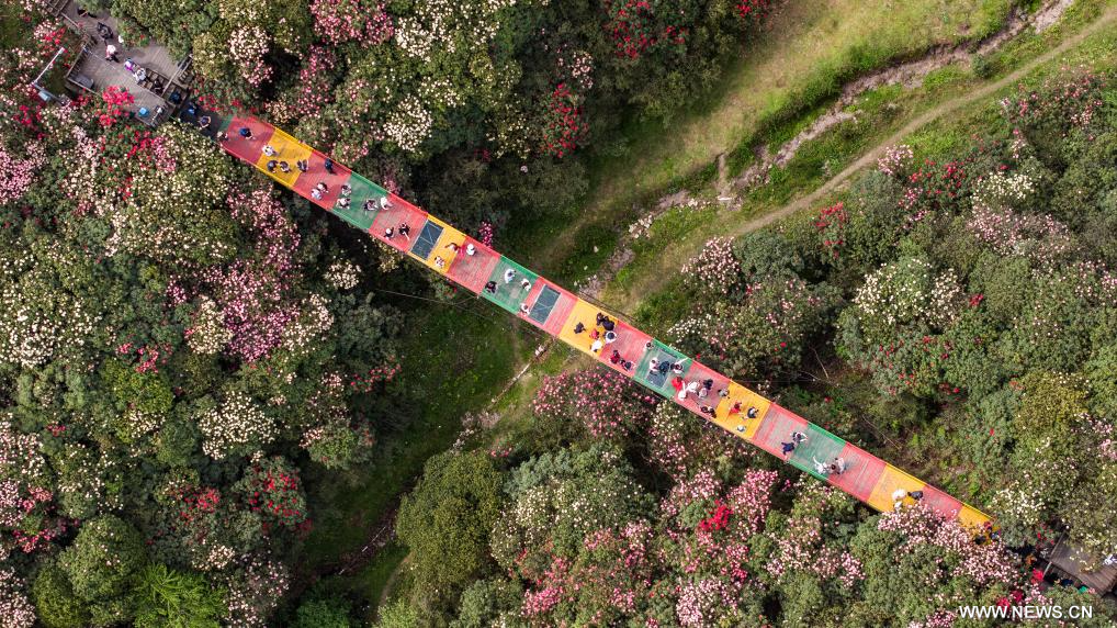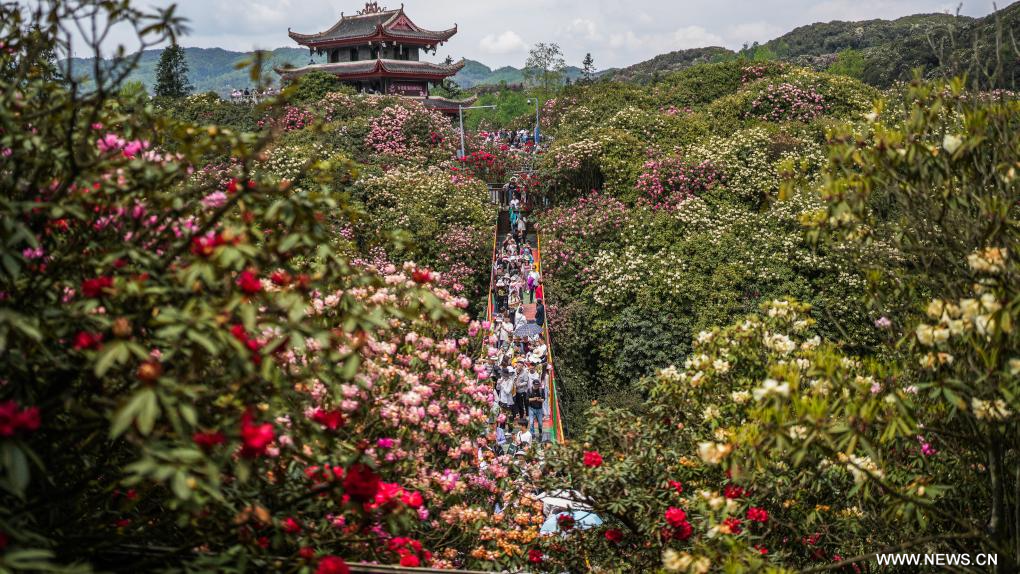 في الصورة الملتقطة جوا يظهر زوار يتمتعون بزهور الأزاليا في محمية بايلي أزاليا الطبيعية في مدينة بيجيه بمقاطعة قويتشو في جنوب غربي الصين. وتجذب زهور الأزاليا المتفتحة في بيجيه العديد من السياح في الربيع.