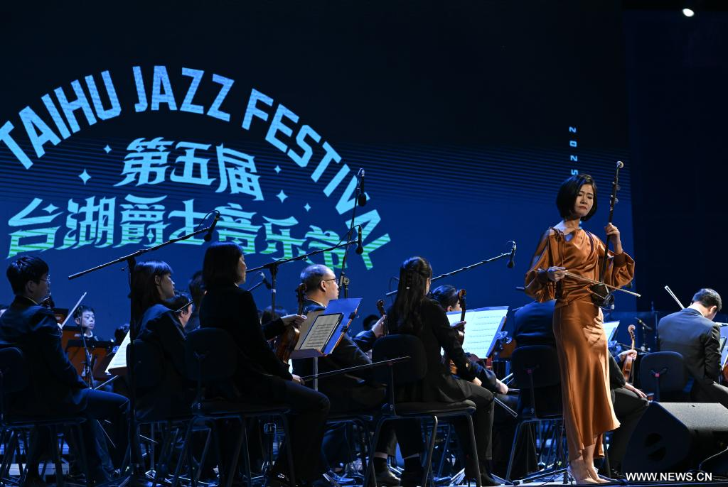 المطرب جيا فان (على اليسار) يؤدي عرضا خلال حفل موسيقي في إطار مهرجان تايهو الخامس للجاز في العاصمة الصينية، بكين. وافتتح المهرجان في حي تونغتشو ببكين يوم الأربعاء الماضي.