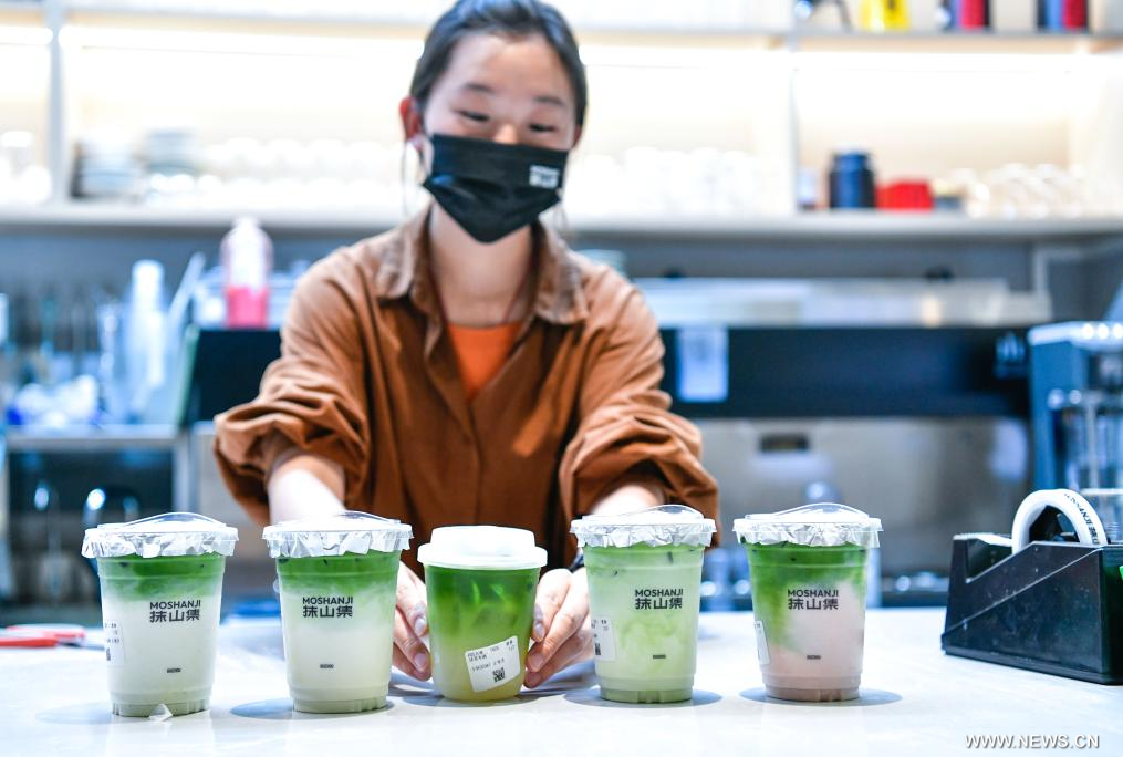 في الصورة الملتقطة تظهر موظفة تقوم بإعداد مشروبات الماتشا في أحد المتاجر بمحافظة جيانغكو في مقاطعة قويتشو بجنوب غربي الصين.